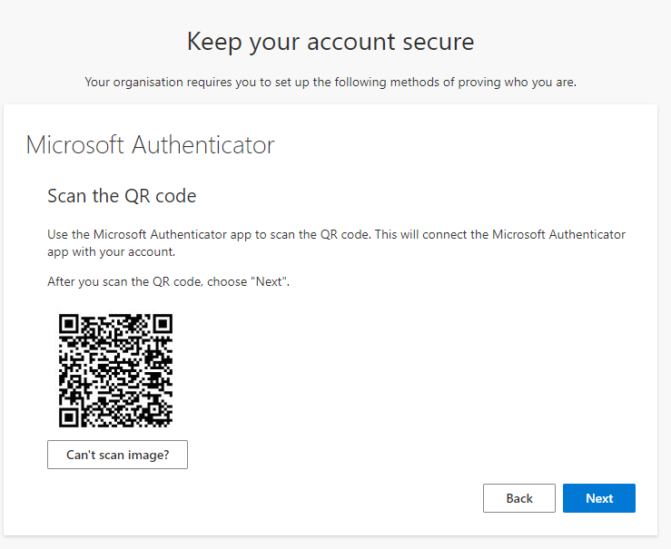 3. The default authentication method is to use the free Microsoft Authenticator app. If you have it installed on your mobile device, select Next and follow the prompts to add this account. If you don't have it installed there is a link provided to download it before proceeding to next step.